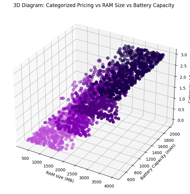 In this three-dimensional map relating RAM size, battery capacity and price range you can see how a higher price is concentrated as long as the battery and RAM have higher capacity. This visualization of the data is useful to evaluate the factors that affect the price.